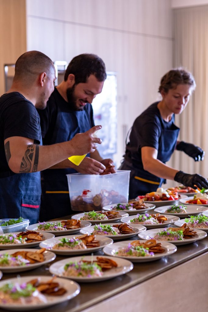 We take a few steps to minimise food waste. First, we work with clients to determine the best format, menu and quantities for their event. Then, our menus are designed to produce as little food waste as possible, utilising all parts of ingredients such as our ‘heads and collars’ fish croquette or our upcycled herb chimichurri. After this, any remaining food waste is sent to a composting facility, and we provide green bins at events we cater for to ensure proper disposal.